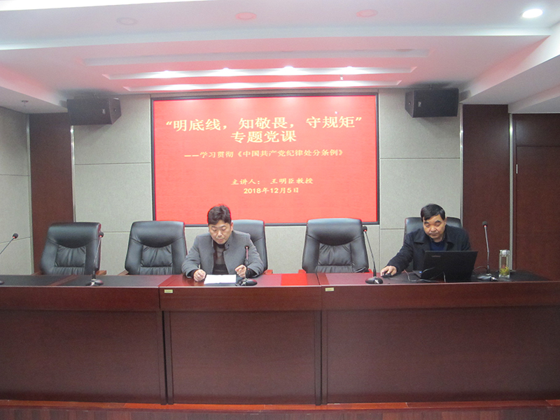 會(huì)上,王明臣教授講述了《中國共產(chǎn)黨紀(jì)律處分條例》修訂情況及意義,對(duì)最新出臺(tái)的《中國共產(chǎn)黨紀(jì)律處分條例》進(jìn)行了詳細(xì)地闡述和分析,以“一、二、三、四、五、六、七、八”即“一個(gè)思想、兩個(gè)堅(jiān)決維護(hù)、三個(gè)重點(diǎn)、四個(gè)意識(shí)、四個(gè)形態(tài)、五處紀(jì)法銜接、六個(gè)從嚴(yán)、七個(gè)有之、八種典型違紀(jì)行為”,言簡意賅地概述了《中國共產(chǎn)黨紀(jì)律處分條例》的特點(diǎn),切實(shí)讓全體黨員對(duì)《中國共產(chǎn)黨紀(jì)律處分條例》有了更加深刻的認(rèn)識(shí)和了解。同時(shí),王明臣教授利用身邊反面典型警醒全體黨員要時(shí)刻以《中國共產(chǎn)黨紀(jì)律處分條例》為準(zhǔn)繩,嚴(yán)守黨的紀(jì)律規(guī)矩,并向全體黨員提出了“謹(jǐn)言慎行、潔身自好”八個(gè)字的要求,進(jìn)一步提升了全體黨員紀(jì)律意識(shí)。